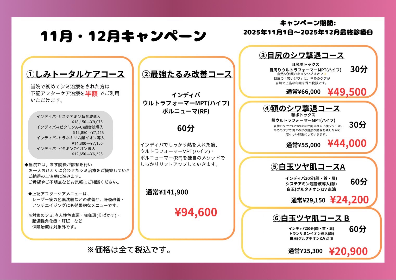 現在当院では、インディバと美白白玉点滴(グルタチオン)のお得なキャンペーンも開催しておりますので、ご興味があるかたは是非この機会に受けてみてはいかがでしょうか?★