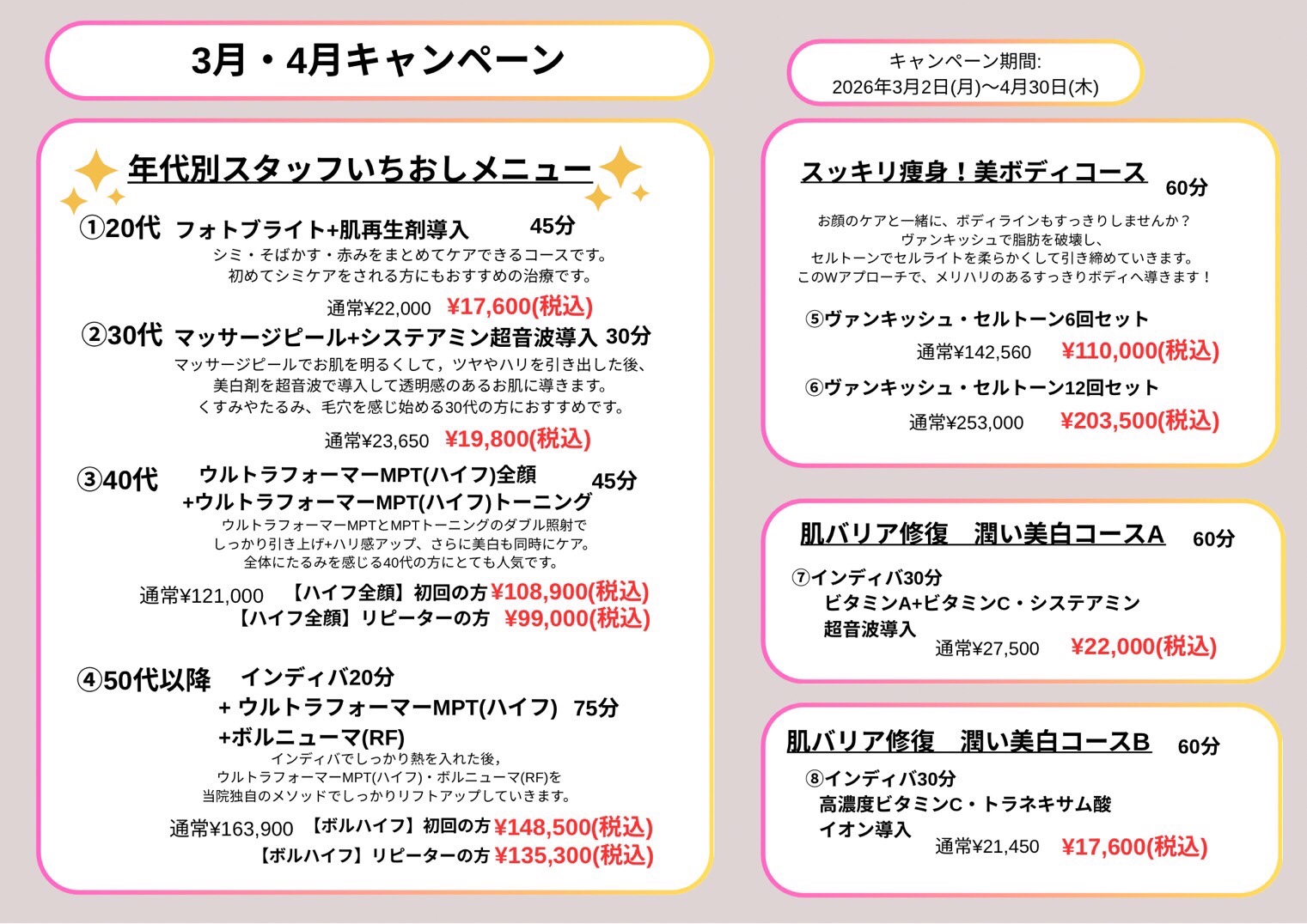 3月と4月で大変お得なキャンペーンを行いますのでみなさんぜひお尋ねくださいませ。